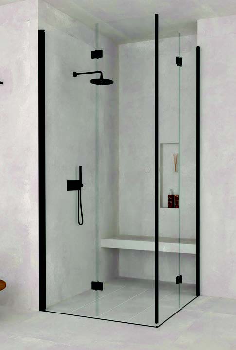 Box angolare APERTURA TOTALE IN/OUT, porta a battenti divisi, chiusura magnetica, cristallo temperato da 6 mm H. 200 cm.